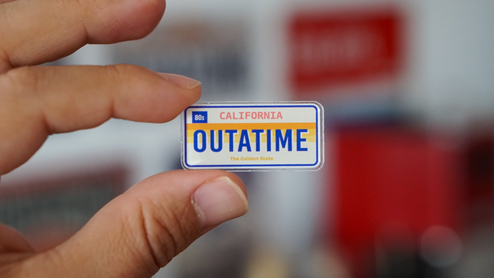 Revive the 80s with our "Back to the Future" inspired OUTATIME California License Plate Pin.